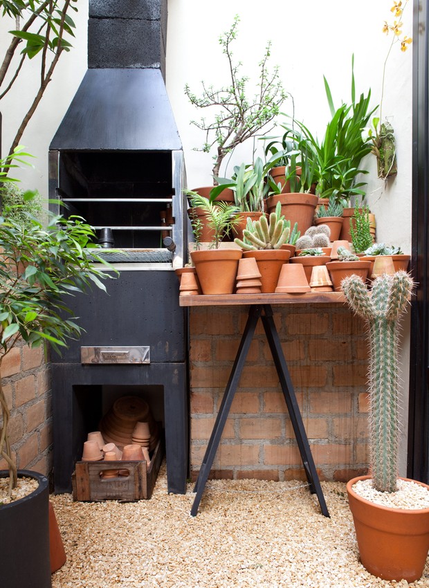 E para receber a família e os amigos, nada melhor do que um cantinho para o churrasco! Ele não precisa ser grande, basta ter uma churrasqueira e um espaço para sentar-se.